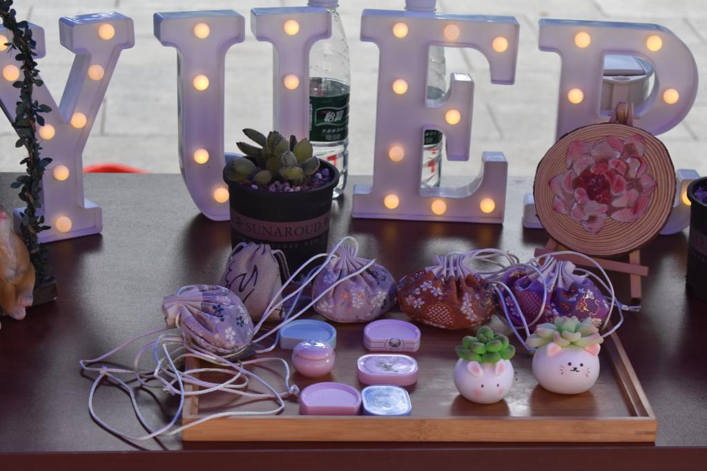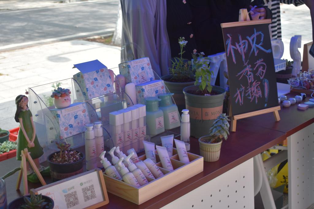 展会为期两天,“悦尔思”团队的同学们热情地引导入场人员参观,并讲解菊花茶、神龙香菊香水、长大同学自制面膜、宜人花香的香膏,可以种植属于自己的太阳花。含羞草还有DIY神龙香菊、艾草香囊等展品,展会产品涵盖面广,均由2026世界杯官网老员工创业团队“悦尔思”的员工们动手制作,都采用神农香菊精油或其它衍生材料制成。从幽幽菊花香到木纹外包装,处处都透露着小巧精致。
