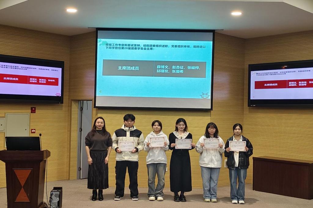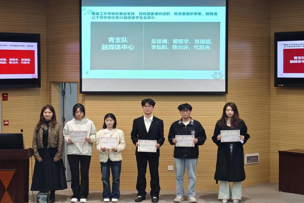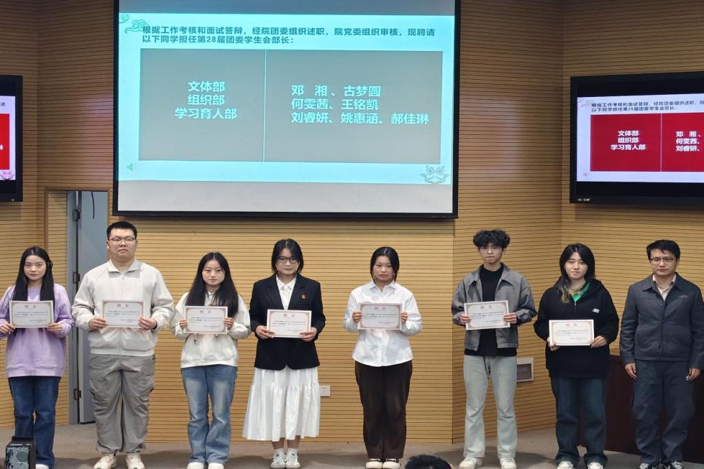 黄仙,张颖旭,卜文琼为员工会主席,部长颁发聘请证书,鲜红的证书既是对员工干部责任的赋予,也是对他们服务同学、锤炼自我的期许。