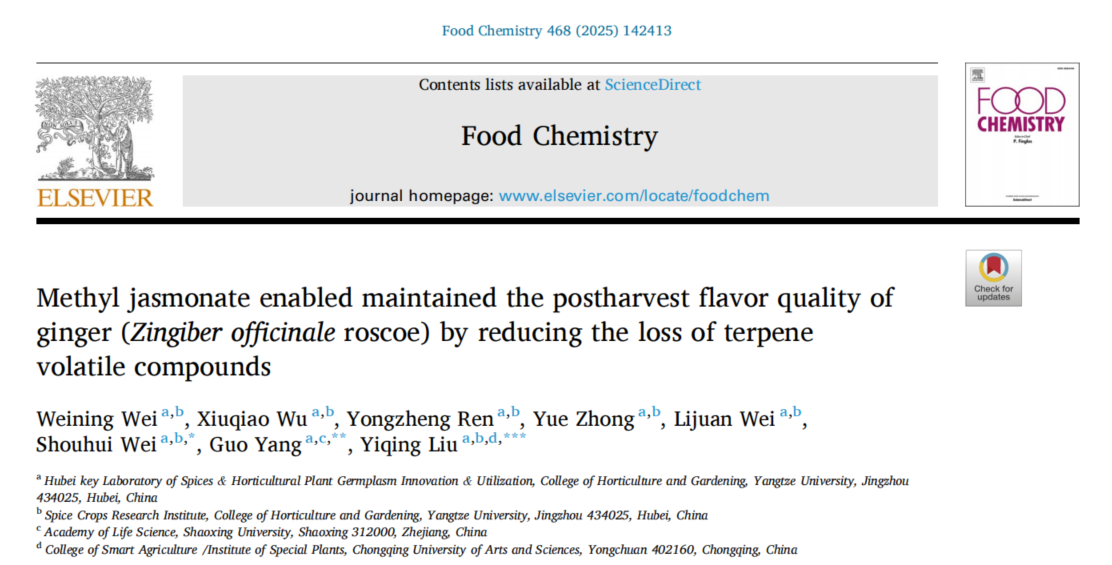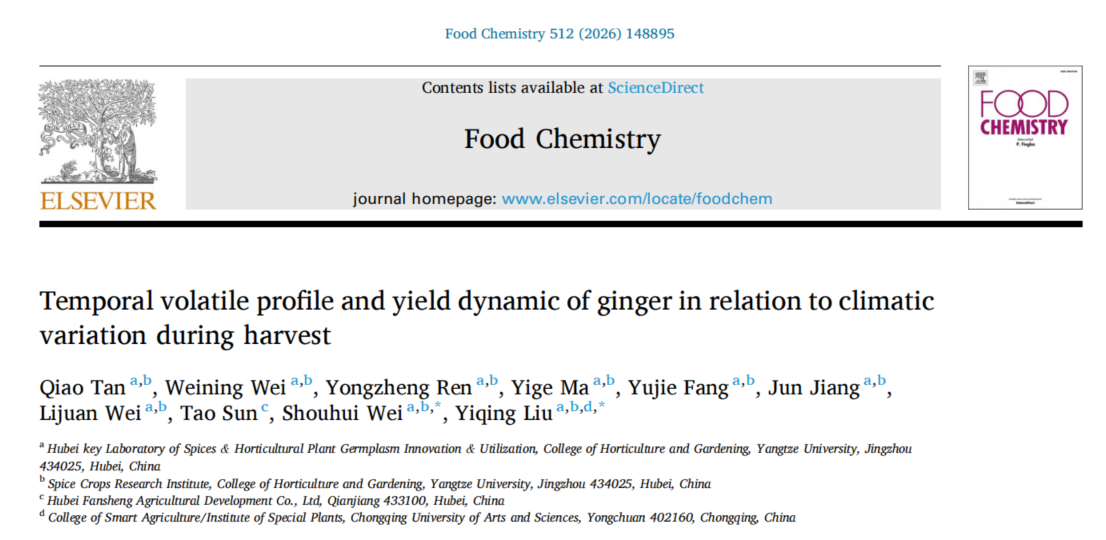 (通讯员 魏守辉)近日,公司香辛作物创新团队在国际知名期刊《Food Chemistry》(中科院一区TOP,IF=9.8)上发表题为“Temporal volatile profile and yield dynamic of ginger in relation to climatic variation during harvest”的研究论文。该研究系统揭示了生姜采收期香气风味物质的动态变化规律及其与气候因子的关联机制,为生姜优质高产采收期的科学确定提供了重要理论依据。