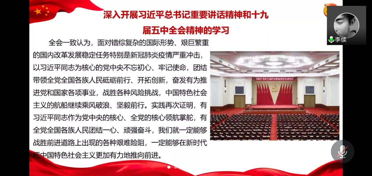 “十四五”时期是我国在全面建成小康社会、实现第一个百年奋斗目标之后,乘势而上开启全面建设社会主义现代化国家新征程、向第二个百年奋斗目标进军的第一个五年。各班团支部组织学习了《习近平总书记论青少年成长(第三辑)》,中国共产党第十九届中央委员会第五次全体会议公报,习近平:关于《中共中央关于制定国民经济和社会发展第十四个五年规划和二〇三五年远景目标的建议》的说明等重要材料。本院师生积极响应,积极参与,各团支部学习小组通过“学、思、传、行”,将学习贯彻习近平总书记重要讲话精神和党的十九届五中全会精神同本院师生学习、工作实际相结合,开展线上线下讨论,交流学习心得,学深悟透、融会贯通,确保学习收到实效。