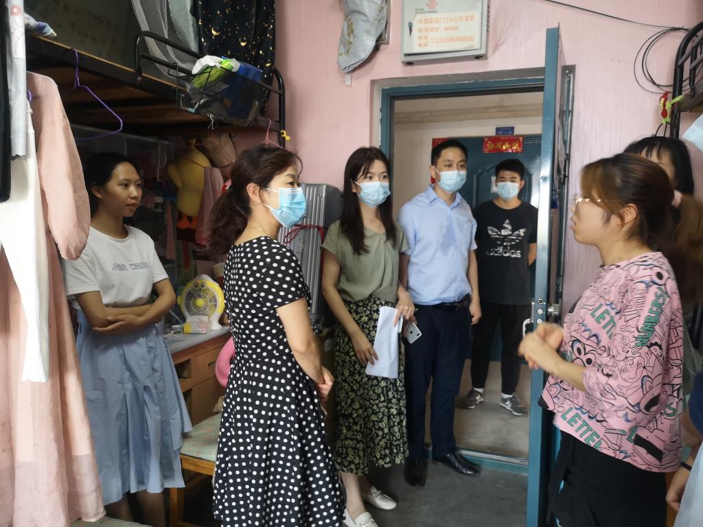 在走访宿舍过程中,老师们认真查看了员工宿舍的环境卫生、防疫情况、消防安全设施等情况,并提醒注意宿舍用电、人身财物等安全问题,询问同学们的学业安排和当前状况,对同学们提出的问题给出相关建议。