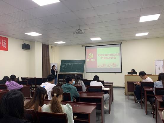 会议第一部分,开展党的发展对象征求党内意见座谈会,徐耀文、蔡田庆、涂浩、李朵依次汇报了自己对党的认识、学习科研成果和生活中的表现,表明了入党决心。
