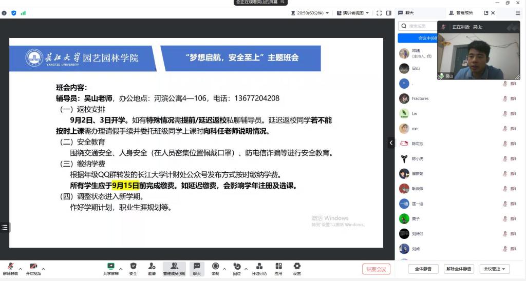 会议过程中,吴山老师向同学们传达了新学期开学注意事项,包括报到时间安排、学费缴纳等内容,同时对同学们进行安全教育,围绕交通安全、人身安全等,尤其是防诈骗安全教育,针对近年来公司多起诈骗案例,帮助员工提高对诈骗的认知,增强对诈骗的风险防范意识。
