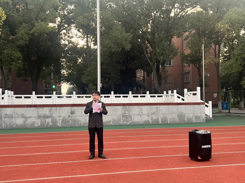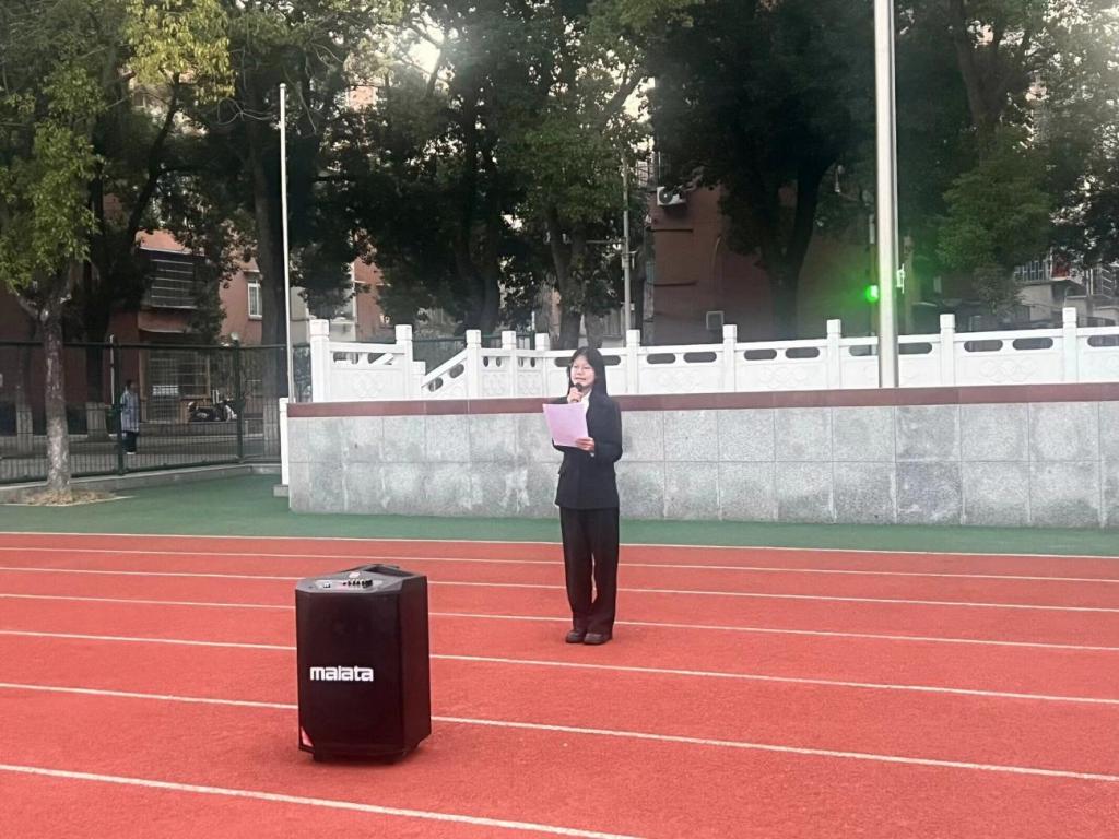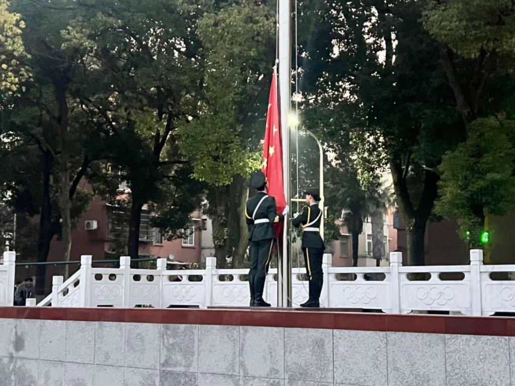 在升旗仪式中,国旗护卫队旗手护送国旗至升旗台,擎旗、撒旗,随着国旗缓缓升起,全体师生齐唱中华人民共和国国歌。接下来,员工代表舒文雪和辅导员张颖旭分别进行国旗下的讲话。