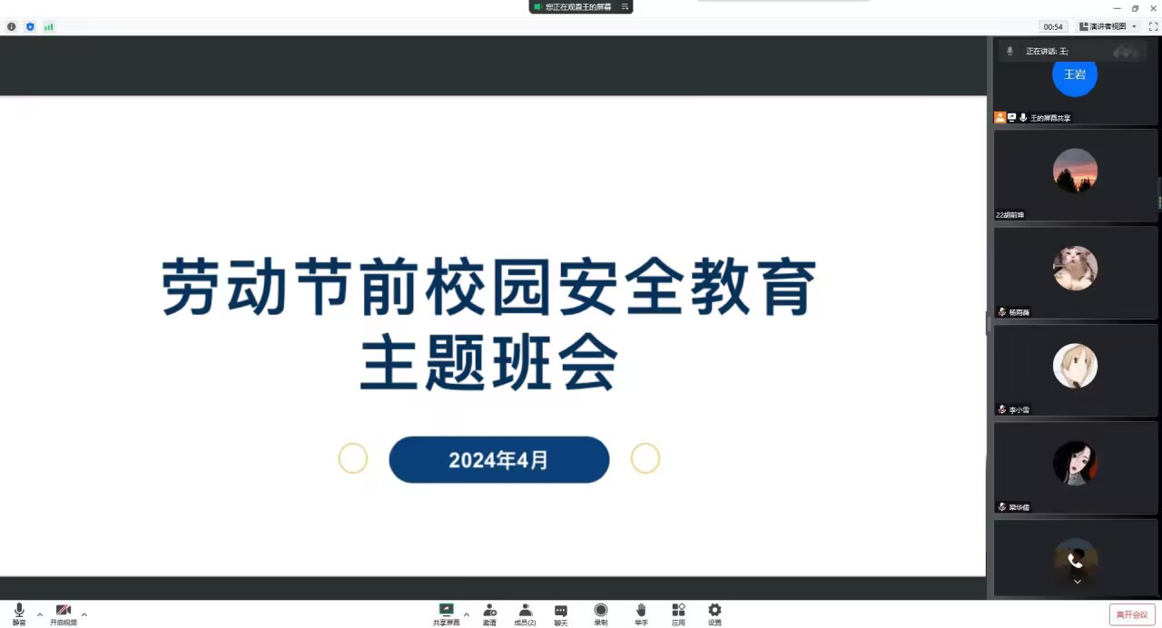 通过班会的开展,同学们意识到加强安全防范意识的重要性,并表示会确保自身安全,五一做到不请假不出校,出校前按要求履行请假手续,不私自离、返校,对自己负责,对家长负责,对老师负责,对公司负责。