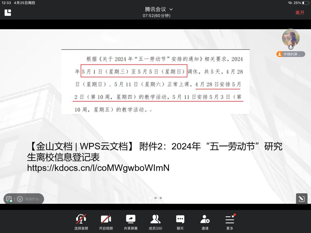 (通讯员:邓婧)“五一”小长假即将来临,为贯彻落实公司对员工假期安全教育及管理工作方面的要求,确保公司同学能够提高安全意识,度过安全愉快的假期。4月24日-4月26日以班级为单位召开研究生“五一”劳动节安全教育班会。
