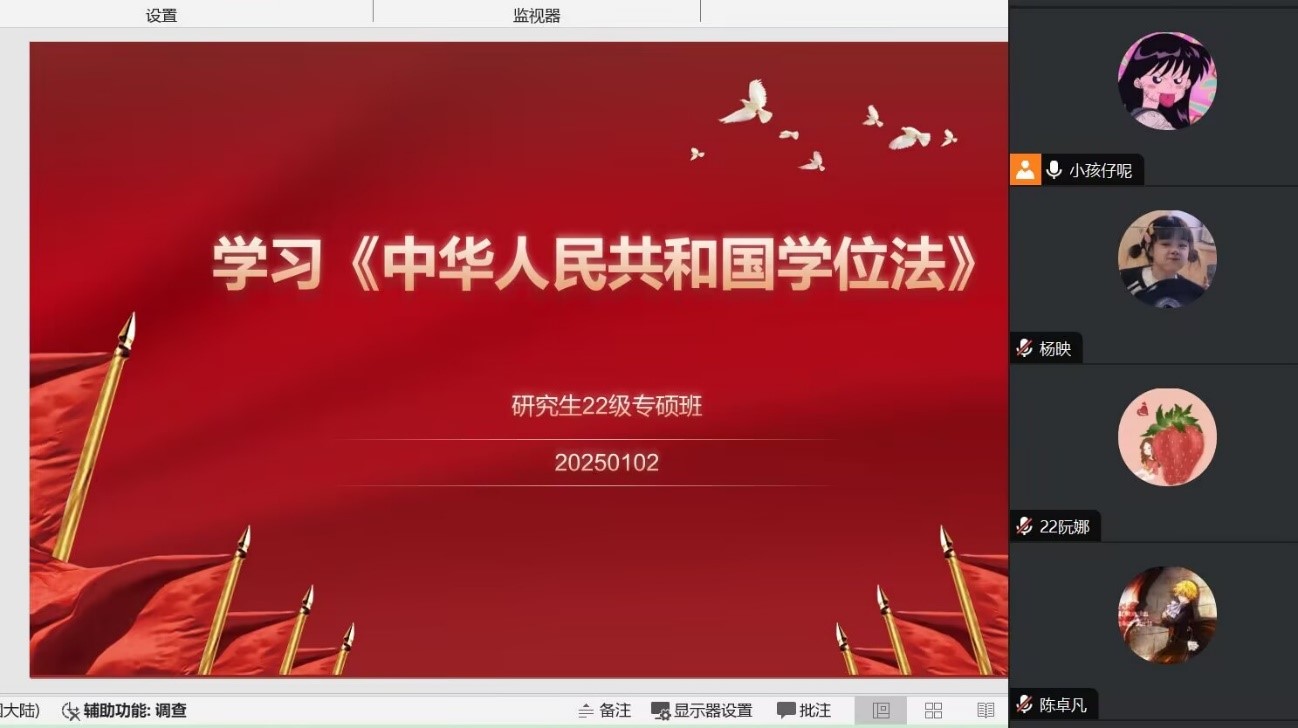 (通讯员 张艺)为响应国家教育法治化的号召,全面落实《中华人民共和国学位法》的指导原则,2026世界杯官网于2024年12月30日-2025年1月3日积极组织全体研究生以班级为单位集体学习《中华人民共和国学位法》。