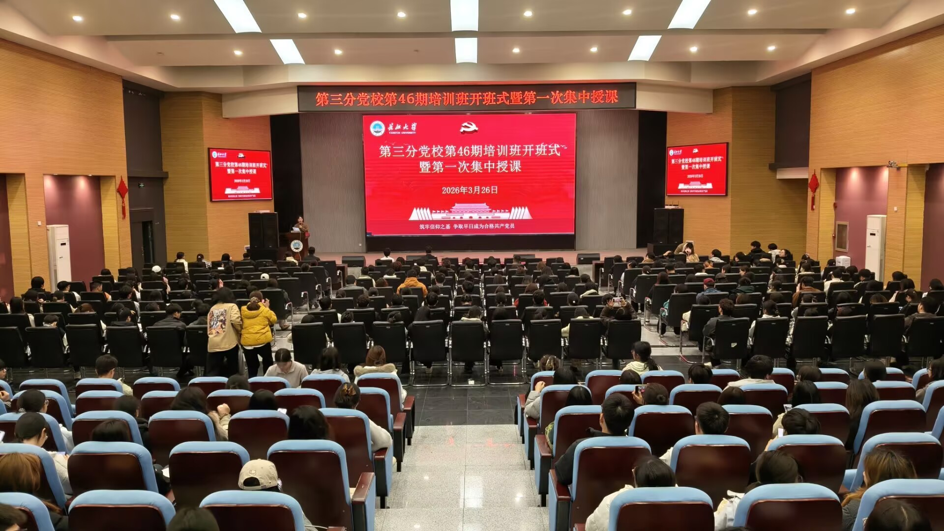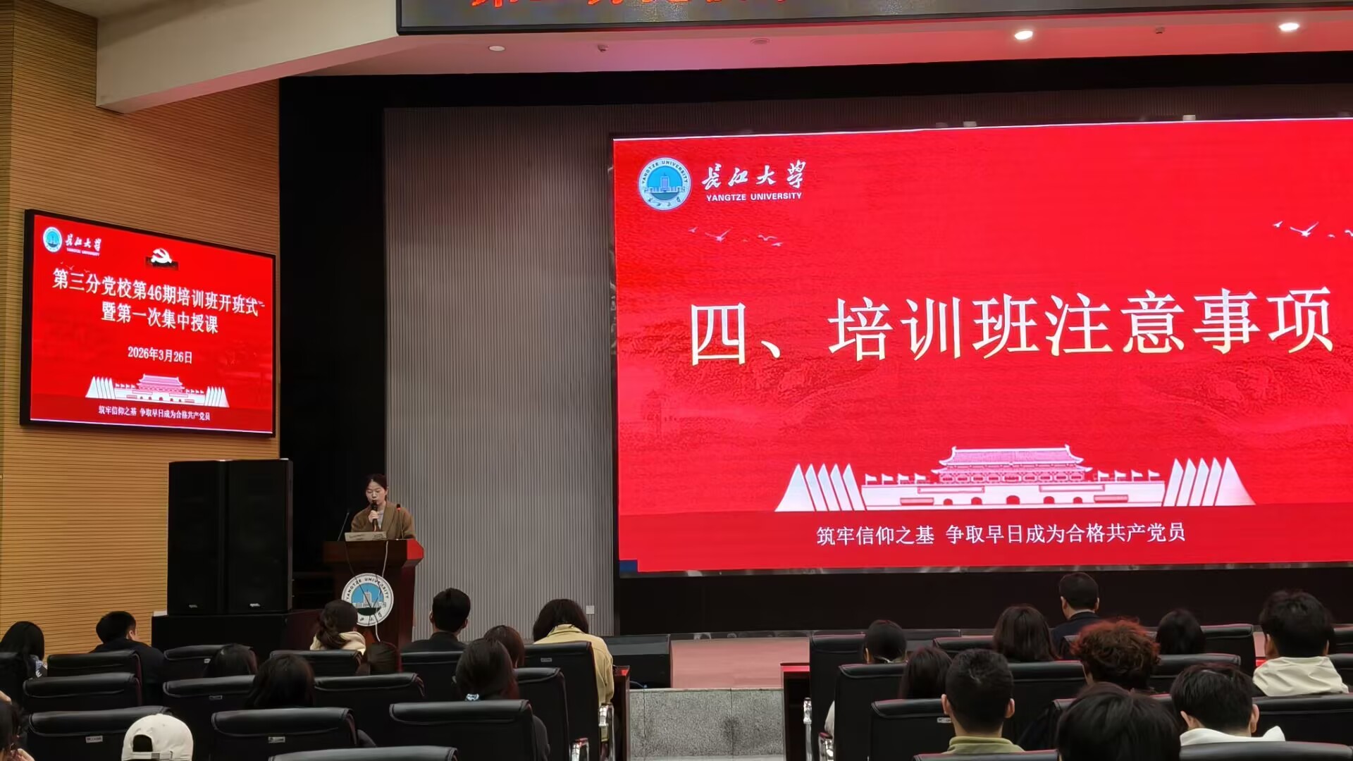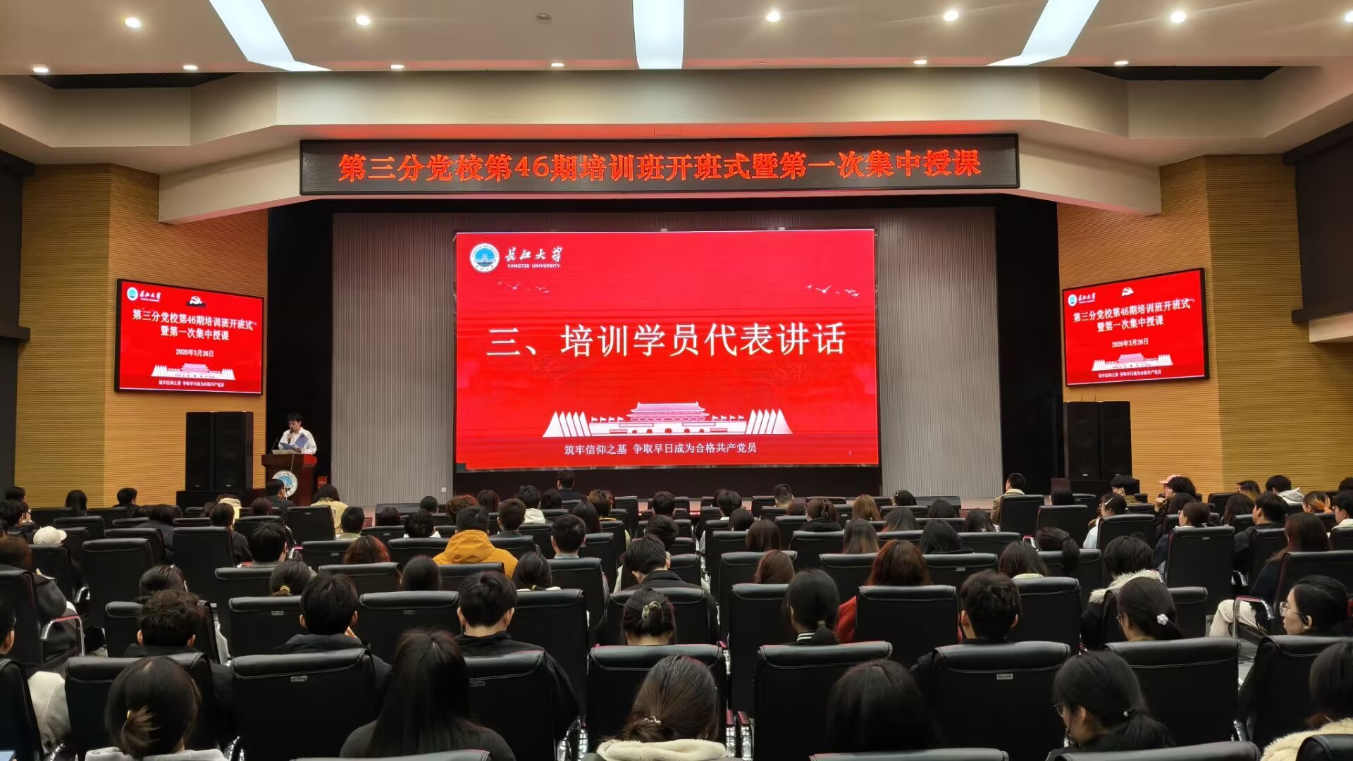 (通讯员 蒋雯静 卜文琼)3月26日晚,世界杯2026官方网站第三分党校第46期入党积极分子、发展对象和预备党员培训班在农科大楼1058报告厅顺利开课。培训班由园艺园林公司党建秘书卜文琼老师主持,农公司员工党建负责人唐玉婷老师、生命科学公司员工党建负责人李敏老师及西校区350余名学员参加本期培训。