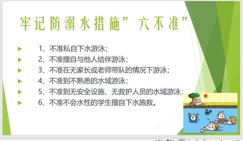 各班班会以实际发生的案例为切入点,以预防员工溺水为重点,利用观看视频等方式讲话员工安全教育。对员工进行预防溺水的知识普及教育:不私自下水游泳;不擅自与他人结伴游泳;不在无家长或教师带领的情况下游泳;不到无安全设施、无救援人员的水域游泳;不到不熟悉的水域游泳;不熟悉水性的同学不擅自下水施救。