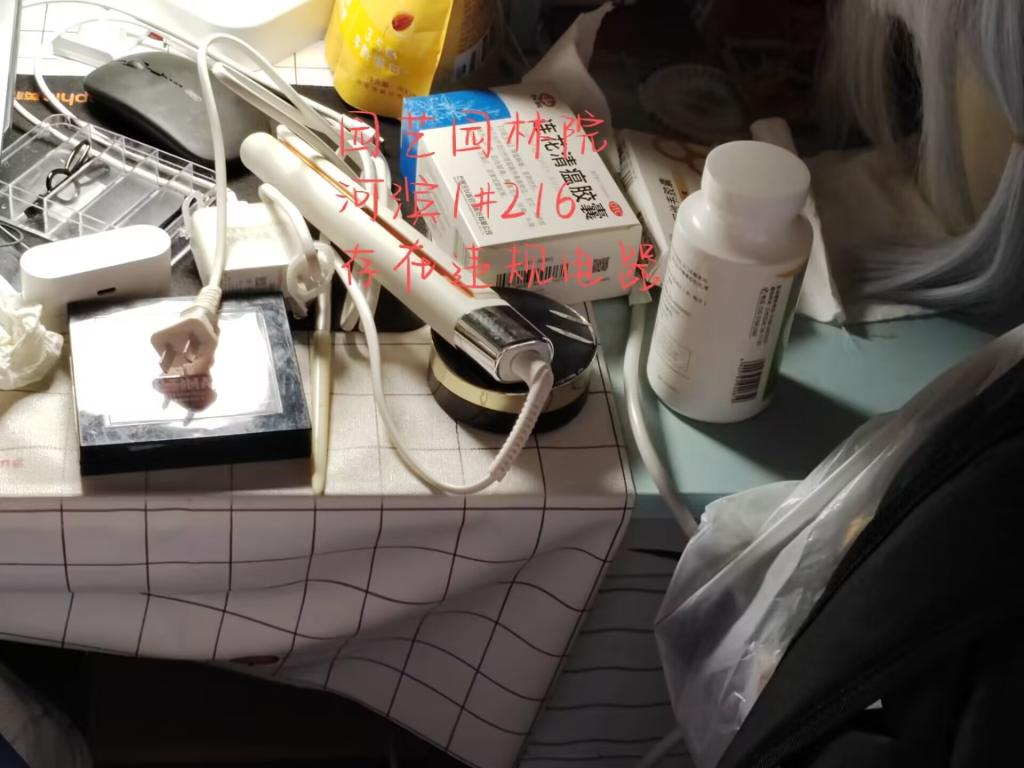 1. 河滨1栋216,景园32201班,李沿润,女,桌面物品未整理,使用插电式烫发直板夹,存在用电安全隐患。