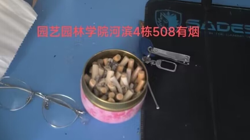 1.河滨4栋508,园林32202班,刘高浩,男:烟灰缸内留存大量烟头,存在严重的火灾隐患。