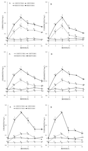 图2 淹水胁迫下嫁接苦瓜的无氧呼吸酶活性