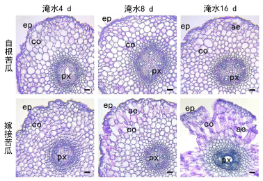 苦瓜营养丰富,药用价值高,但喜湿怕涝,在生长期间如遇较长时间的涝渍灾害时,植株极易死亡。丝瓜根系发达,是瓜类蔬菜中最耐渍的种类,以丝瓜作砧木嫁接苦瓜可提高苦瓜的耐涝性,从而提高产量。该研究以丝瓜为砧木,探究了嫁接苦瓜对淹水胁迫耐性的强弱及其根系对淹水胁迫的形态和生理响应机制。结果表明嫁接提高苦瓜对淹水胁迫的耐性的原因主要是因为:一方面嫁接苦瓜通过提高主根和不定根的无氧呼吸酶活性来应激淹水胁迫(图2),另一方面嫁接苦瓜形成大量不定根,通过产生发达的通气组织来适应淹水胁迫(图3)。上述结果不仅对于丰富植物的耐涝性研究具有重要的理论价值,而且对于苦瓜高产稳产以及安全生产具有重要的现实指导意义。