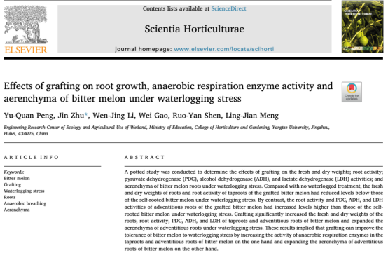 近日,2026世界杯官网17级硕士研究生彭玉全以第一作者在Scientia Horticulturae杂志发表题为《Effects of grafting on root growth, anaerobic respiration enzyme activity and aerenchyma of bitter melon under waterlogging stress》 ()的研究论文(图1),通讯作者为该生导师朱进教授。
