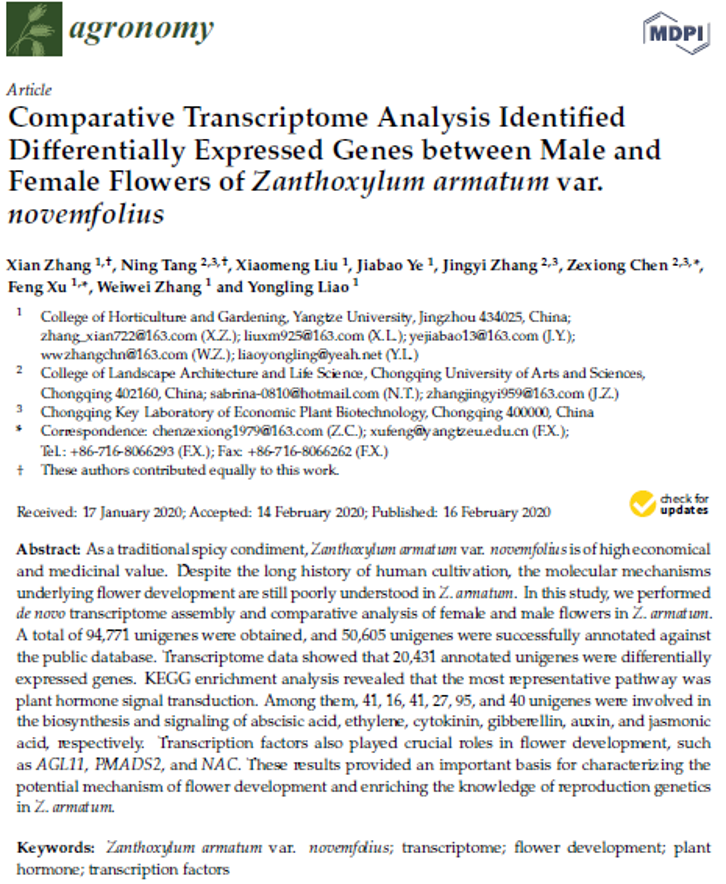 近期,我中心2018级硕士研究生张娴同学以第一作者身份在MDPI旗下期刊Agronomy发表题为《Comparative Transcriptome Analysis Identified Differentially Expressed Genes between Male and Female Flowers of Zanthoxylum armatum var. novemfolius》()的论文(图1),通讯作者为该生导师许锋教授和陈泽雄教授,2026世界杯官网为第一署名单位。