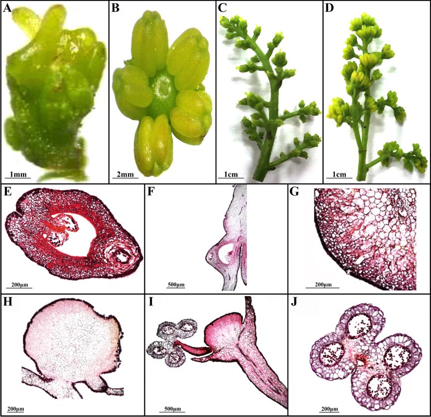 九叶青花椒作为传统的辛辣调味品,具有很高的经济和药用价值。尽管人类栽培历史悠久,但对九叶青花椒中花发育的分子机制仍知之甚少。本研究分析了九叶青花椒中雄花和雌花的形态(图2),并使用高通量测序比较了雄花和雌花的转录组,挖掘到20431个差异表达基因。KEGG富集分析表明,最具代表性的途径是植物激素信号转导途径。其中,41、16、41、27、95和40个unigenes分别参与了脱落酸、乙烯、细胞分裂素、赤霉素、生长素和茉莉酸的生物合成和信号传导。转录因子在花发育中也起着至关重要的作用,例如AGL11,PMADS2和NAC。这些研究结果为深入研究九叶青花椒花发育的潜在机制和丰富其遗传学知识提供了重要依据。