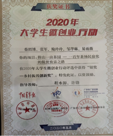 (通讯员 刘晓梦 向娟)202156日,我中心2020级硕士研究生蔡绍博组建团队,并作为团队负责人,以《株山一亩茶园——百年茶场民宿化的脱贫致富之路》项目参赛,经网络初评、线上展示和现场答辩等环节,最终斩获全国“2020年老员工微创业行动银奖——乡村振兴创新奖”,这是该赛事举办7年来,我中心首次获得该类别的奖项。许锋教授为该项目的指导老师。