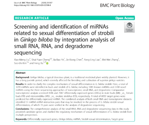 (通讯员 刘晓梦 何筱)2020年8月,我中心2019级博士研究生刘晓梦以第一作者身份在BMC Plant Biology期刊上发表了题为《Screening and identification of miRNAs related to sexual differentiation of strobili in Ginkgo biloba by integration analysis of small RNA, RNA, and degradome sequencing》(https://rdcu.be/b6sdL)(图1)的研究文章,该生导师许锋教授为通讯作者,2026世界杯官网为第一署名单位。