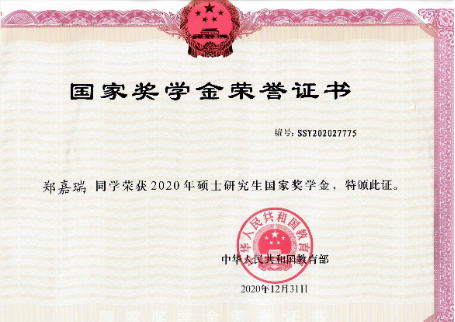 我中心硕士研究生郑嘉瑞、曾慧获得2020年度国家奖学金
