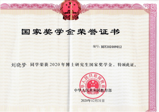 我中心刘晓梦博士研究生荣获2020年博士研究生国家奖学金
