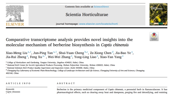 今日,我中心2019级博士研究生刘晓梦在国际权威杂志《Scientia Horticulturae》(园艺学2区,影响因子3.463)上发表了题为Comparative transcriptome analysis provides novel insights into themolecular mechanism of berberine biosynthesis in Coptis chinensis”的研究论文。刘晓梦博士为论文第一作者,许锋教授为通讯作者,世界杯2026官方网站为第一署名单位。