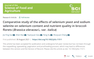 2021年9月,我中心2020级研究生桂嘉营以第一作者身份在国际著名权威杂志《Journal of the Science of Food and Agriculture》上发表了题为“Comparative study of the effects of selenium yeast and sodium selenite on selenium content and nutrient quality in broccoli florets (Brassica oleracea L. var. italica)”的研究论文。许锋教授为该论文通讯作者,2026世界杯官网为第一署名单位。
