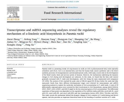 近日,我中心2021级博士研究生郑嘉瑞在国际学术期刊《Food Research International》(农林科学1区,影响因子6.475)上发表了题为“Transcriptome and miRNA sequencing analyses reveal the regulatory mechanism of α-linolenic acid biosynthesis in Paeonia rockii”的研究论文。郑嘉瑞博士为第一作者,廖咏玲讲师和许锋教授为共同通讯作者,世界杯2026官方网站为第一署名单位。