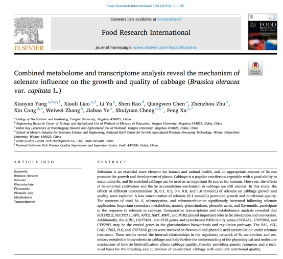 近日,我中心博士后杨晓燕在国际学术期刊《Food Research International》(农林科学1区,影响因子6.475)上发表了题为“Combined metabolome and transcriptome analysis reveal the mechanism of selenate influence on the growth and quality of cabbage (Brassica oleracea var. capitata L.)”的研究论文。杨晓燕博士为第一作者,许锋教授为通讯作者,世界杯2026官方网站为第一署名单位。