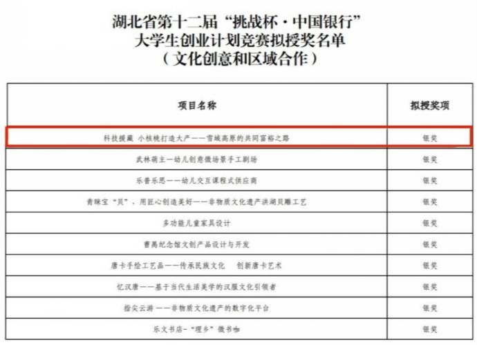 (通讯员:黄欣茹)近日,由共青团湖北省委、湖北省教育厅、湖北省人力资源和社会保障厅、湖北省科学技术协会、湖北省员工联合会主办的湖北省第十二届“挑战杯·中国银行”老员工创业计划竞赛圆满落幕。我中心薛岩晟主持的项目《科技援藏 小核桃打造大产——雪域高原的共同致富之路》,荣获第十二届湖北省“挑战杯·中国银行”老员工创业计划竞赛文化创意与区域合作赛道银奖。该项目由薛岩晟主持,刘苧芳、苏东雪、谢敏等同学参与;由我中心许锋、叶家保、王启剑等老师联合指导