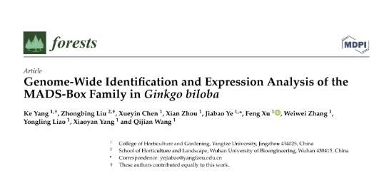 2022年11月,我中心硕士研究生杨可在国际植物学期刊Forests(3区,IF:3.282)在线发表了题为“Genome-wide identification and expression analysis of the MADS-box family in Ginkgo biloba”的研究论文。该研究对银杏MADS-box家族成员进行了鉴定和分析,拟进一步研究MADS-box转录因子在银杏开花调控过程中的作用,以期达到从分子生物学层面促进银杏开花与加速优良品种选育的目的。