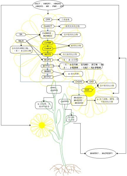 该文进一步对母菊萜类化合物的生物合成和调控的研究进展进行了总结和讨论。花香是高等植物花器官所释放的各类挥发性物质的混合物,而萜类物质则是花香挥发物质的主要成分。作为母菊挥发油主要成分的倍半萜类化合物兰香油薁以及α-甜没药醇的含量与CPR和TPS基因的表达量呈正相关,这两种关键酶和基因的表达水平的提高可有效提高母菊兰香油薁和α-甜没药醇的含量,从而增加母菊的药用价值和经济潜能。根据上述研究表明,母菊中萜类及倍半萜类化合物的合成则主要与AATC、PMK、MVK、HMGS、HMGR、FPS、βFS、GDS、GAS等酶基因的催化及表达量高度相关,且在母菊不同器官中的表达模式与相应器官中萜类产物的含量呈正相关。这些基因和酶在花中表达量最高,与之相反的是,母菊SQS基因会竞争性地与FPP底物结合,抑制倍半萜的合成速率。由于萜类物质能被害虫侵蚀所诱导,GDS合酶的表达量在幼花中均高于老花,是因为幼嫩的组织更容易受到昆虫攻击。另外,外源激素MeJA不仅能上调McHMGS、MrFPS以及βFS基因的表达,也能诱导法炔基焦磷酸合酶和(E)-b法炔合酶的表达,促进倍半萜类化合物的生物合成。