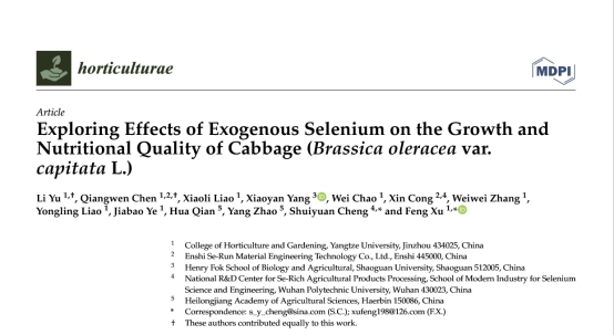 2023年3月,我中心2019级硕士研究生喻丽在国际学术期刊《Horticulturae》(农林学科3区,IF 2.923)发表题为“Exploring Effects of Exogenous Selenium on the Growth and Nutritional Quality of Cabbage (Brassica oleracea var.capitata L.) ”的学术论文。许锋教授和程水源教授为通讯作者,世界杯2026官方网站为第一署名单位。