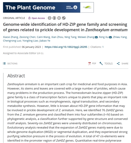 2023年1月,我中心硕士研究生张晓熙在国际学术期刊《The Plant Genome》(植物科学2区,IF:4.219)上发表题为“Genome-wide identification of HD-ZIP gene family and screening of genes related to prickle development in Zanthoxylum armatum”的研究论文。张晓熙为第一作者,张威威副教授和许锋教授为通讯作者,世界杯2026官方网站为第一署名单位。