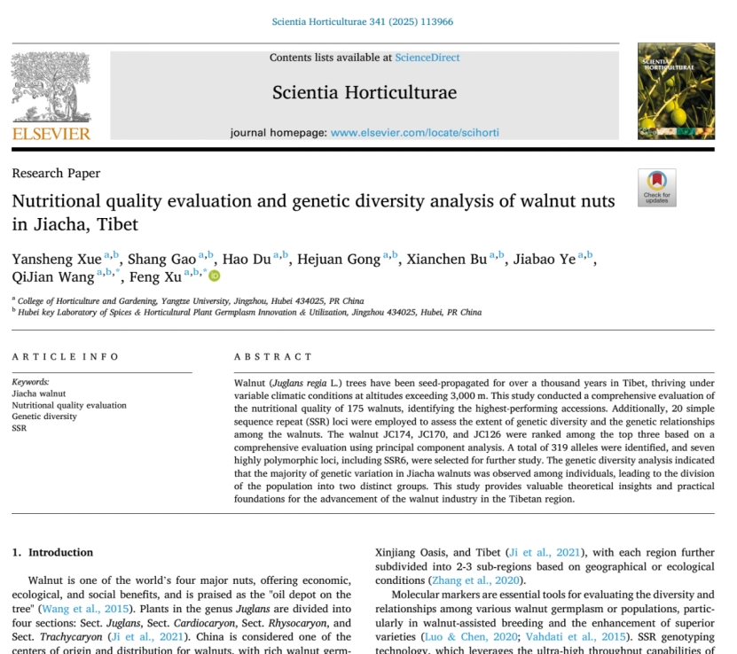 近日,长大植物硒学团队科研助理薛岩晟在国际学术期刊《Scientia Horticulturae》(农科科学2区Top,IF:3.9)上发表题为“Nutritional quality evaluation and genetic diversity analysis of walnut nuts in Jiacha, Tibet”的研究论文。2026世界杯官网王启剑副教授和许锋教授为通讯作者,世界杯2026官方网站为第一署名单位。