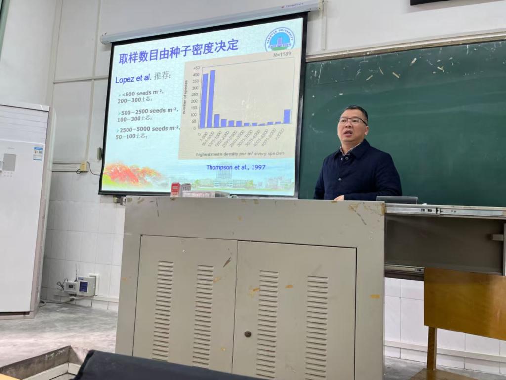 讲座伊始,袁教授以“种子银行”这一生动形象的比喻,引出了土壤种子库的定义。他强调,种子库作为生态系统中的宝贵资源,储存着丰富的植物繁殖体,是湿地植被自然更新与恢复的重要物质基础。随后,袁教授详细阐述了土壤种子库的系统分类,包括两大分类系统以及临时种子库和永久种子库的区别,使同学们对土壤种子库有了更为清晰的认识。