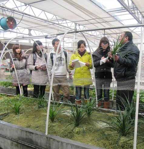 同学们在公司温室里上水培花卉栽培课